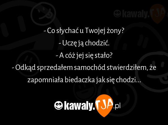 - Co słychać u Twojej żony? - Uczę ją chodzić. - A cóż jej się stało? - Odkąd sprzedałem samochód stwierdziłem, że zapomniała biedaczka jak się chodzi...