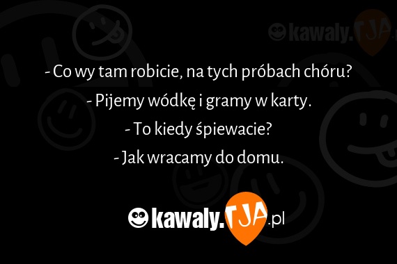 - Co wy tam robicie, na tych próbach chóru? - Pijemy wódkę i gramy w karty. - To kiedy śpiewacie? - Jak wracamy do domu.