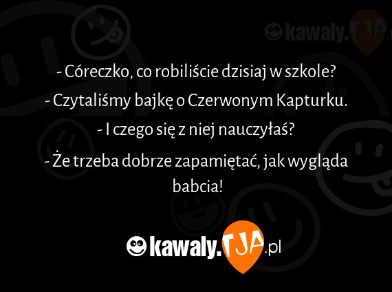 - Córeczko, co robiliście dzisiaj w szkole? - Czytaliśmy bajkę o Czerwonym Kapturku. - I czego się z niej nauczyłaś? - Że trzeba dobrze zapamiętać, jak wygląda babcia!