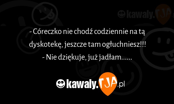 - Coreczko nie chodx codziennie na ta dyskoteke, jeszcze tam ogluchniesz!!! - Nie dziekuje, juz jadlam......
