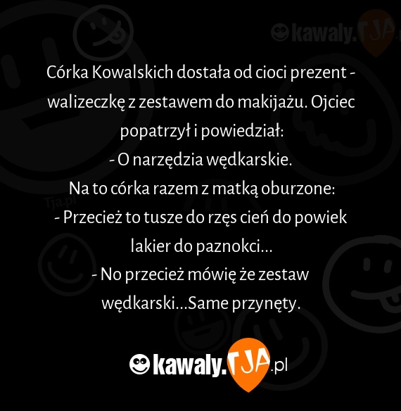 Córka Kowalskich dostała od cioci prezent - walizeczkę z zestawem do makijażu. Ojciec popatrzył i powiedział: