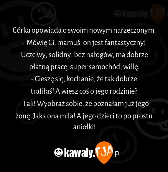 - Mówię Ci, mamuś, on jest fantastyczny! Uczciwy, solidny, bez nałogów, ma dobrze płatną pracę, super samochód, willę.