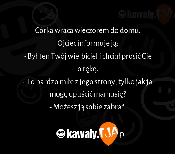 Corka wraca wieczorem do domu. Ojciec informuje ja: - Byl ten Twoj wielbiciel i chcial prosic Cie o reke. - To bardzo mile z jego strony, tylko jak ja moge opuscic mamusie? - Mozesz ja sobie zabrac.