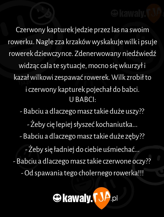 Czerwony kapturek jedzie przez las na swoim rowerku. Nagle zza krzaków wyskakuje wilk i psuje rowerek dziewczynce. Zdenerwowany niedźwiedź widząc cala te sytuacje, mocno się wkurzył i kazał wilkowi zespawać rowerek. Wilk zrobił to i czerwony kapturek pojechał do babci.