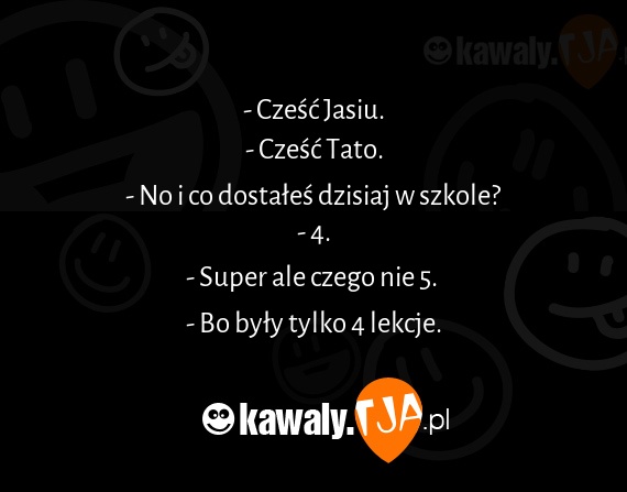 - Cześć Jasiu. - Cześć Tato. - No i co dostałeś dzisiaj w szkole? - 4. - Super ale czego nie 5. - Bo były tylko 4 lekcje.