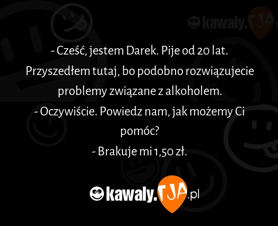 - Czesc, jestem Darek. Pije od 20 lat. Przyszedlem tutaj, bo podobno rozwiazujecie problemy zwiazane z alkoholem. - Oczywiscie. Powiedz nam, jak mozemy Ci pomoc? - Brakuje mi 1,50 zl.