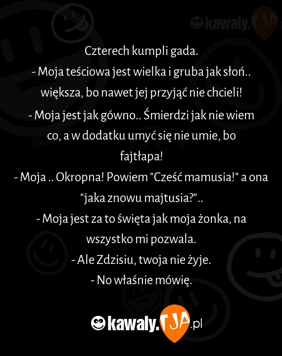 - Moja teściowa jest wielka i gruba jak słoń.. większa, bo nawet jej przyjąć nie chcieli!