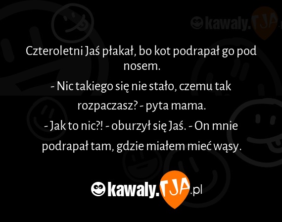 Czteroletni Jas plakal, bo kot podrapal go pod nosem. - Nic takiego sie nie stalo, czemu tak rozpaczasz? - pyta mama. - Jak to nic?! - oburzyl sie Jas. - On mnie podrapal tam, gdzie mialem miec wasy.