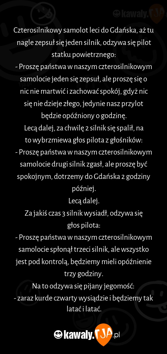 - Proszę państwa w naszym czterosilnikowym samolocie drugi silnik zgasł, ale proszę być spokojnym, dotrzemy do Gdańska 2 godziny później.