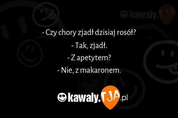 - Czy chory zjadł dzisiaj rosół? - Tak, zjadł. - Z apetytem? - Nie, z makaronem.