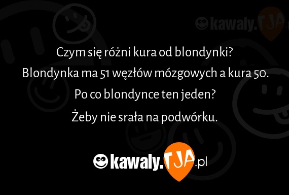 Czym się różni kura od blondynki? Blondynka ma 51 węzłów mózgowych a kura 50. Po co blondynce ten jeden? Żeby nie srała na podwórku.