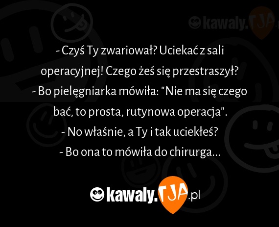 - Czys Ty zwariowal? Uciekac z sali operacyjnej! Czego zes sie przestraszyl? - Bo pielegniarka mowila: "Nie ma sie czego bac, to prosta, rutynowa operacja". - No wlasnie, a Ty i tak uciekles? - Bo ona to mowila do chirurga...