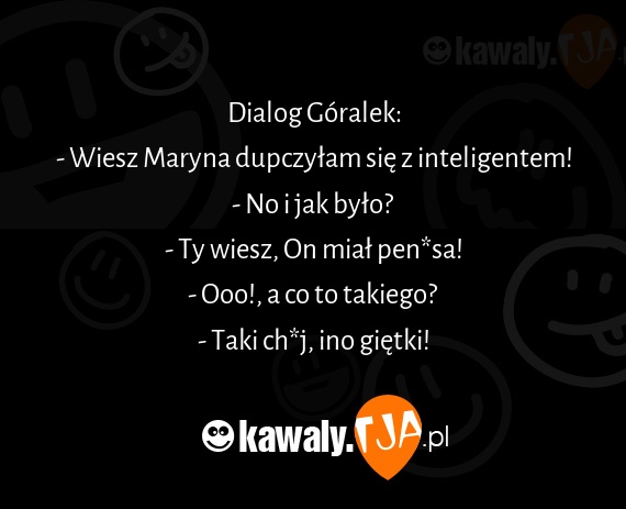 Dialog Goralek: - Wiesz Maryna dupczylam sie z inteligentem! - No i jak bylo? - Ty wiesz, On mial pen*sa! - Ooo!, a co to takiego? - Taki ch*j, ino gietki!