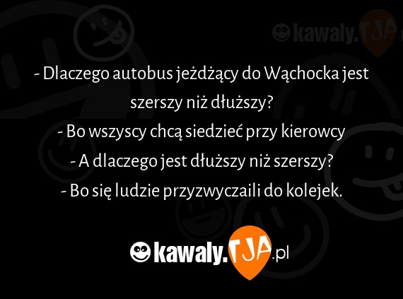 - Dlaczego autobus jezdzacy do Wachocka jest szerszy niz dluzszy? - Bo wszyscy chca siedziec przy kierowcy - A dlaczego jest dluzszy niz szerszy? - Bo sie ludzie przyzwyczaili do kolejek.