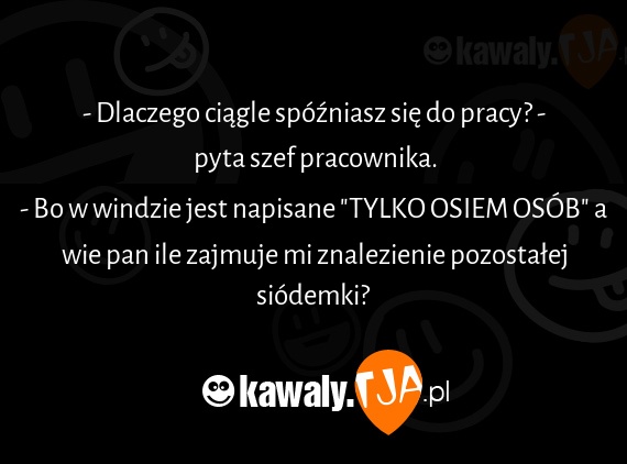 - Dlaczego ciągle spóźniasz się do pracy? - pyta szef pracownika. - Bo w windzie jest napisane "TYLKO OSIEM OSÓB" a wie pan ile zajmuje mi znalezienie pozostałej siódemki?