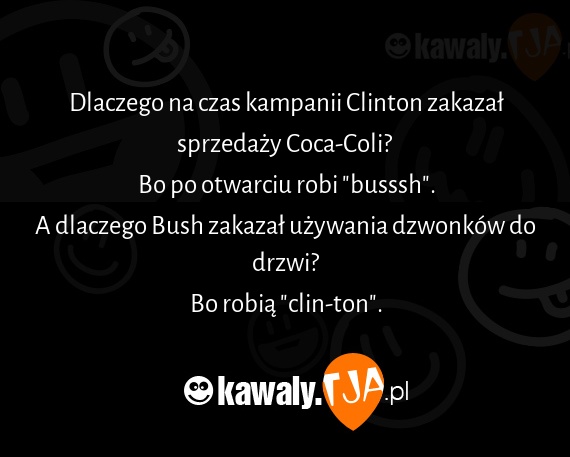Dlaczego na czas kampanii Clinton zakazal sprzedazy Coca-Coli? Bo po otwarciu robi "busssh". A dlaczego Bush zakazal uzywania dzwonkow do drzwi? Bo robia "clin-ton".