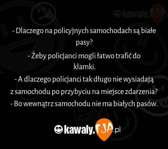 - Dlaczego na policyjnych samochodach są białe pasy? - Żeby policjanci mogli łatwo trafić do klamki. - A dlaczego policjanci tak długo nie wysiadają z samochodu po przybyciu na miejsce zdarzenia? - Bo wewnątrz samochodu nie ma białych pasów.