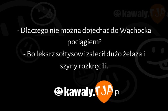 - Dlaczego nie można dojechać do Wąchocka pociągiem? - Bo lekarz sołtysowi zalecił dużo żelaza i szyny rozkręcili.