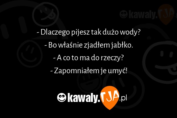 - Dlaczego pijesz tak dużo wody? - Bo właśnie zjadłem jabłko. - A co to ma do rzeczy? - Zapomniałem je umyć!