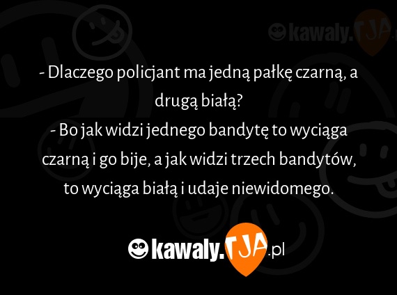 - Dlaczego policjant ma jedną pałkę czarną, a drugą białą? - Bo jak widzi jednego bandytę to wyciąga czarną i go bije, a jak widzi trzech bandytów, to wyciąga białą i udaje niewidomego.
