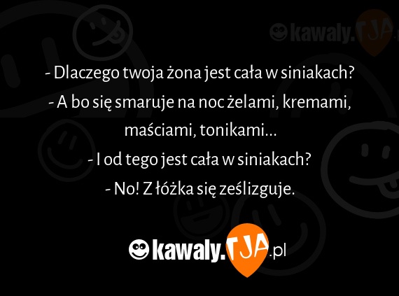 - Dlaczego twoja żona jest cała w siniakach? - A bo się smaruje na noc żelami, kremami, maściami, tonikami... - I od tego jest cała w siniakach? - No! Z łóżka się ześlizguje.