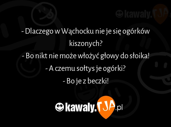 - Dlaczego w Wachocku nie je sie ogorkow kiszonych? - Bo nikt nie moze wlozyc glowy do sloika! - A czemu soltys je ogorki? - Bo je z beczki!