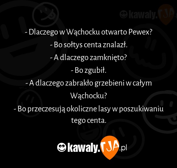 - Dlaczego w Wąchocku otwarto Pewex? - Bo sołtys centa znalazł. - A dlaczego zamknięto? - Bo zgubił. - A dlaczego zabrakło grzebieni w całym Wąchocku? - Bo przeczesują okoliczne lasy w poszukiwaniu tego centa.