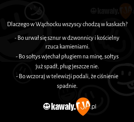 Dlaczego w Wąchocku wszyscy chodzą w kaskach? - Bo urwał się sznur w dzwonnicy i kościelny rzuca kamieniami. - Bo sołtys wjechał pługiem na minę, sołtys już spadł, pług jeszcze nie. - Bo wczoraj w telewizji podali, że ciśnienie spadnie.