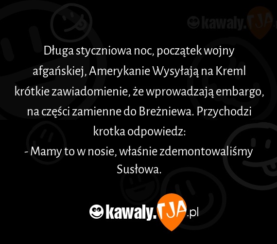 Dluga styczniowa noc, poczatek wojny afganskiej, Amerykanie Wysylaja na Kreml krotkie zawiadomienie, ze wprowadzaja embargo, na czesci zamienne do Brezniewa. Przychodzi krotka odpowiedz: - Mamy to w nosie, wlasnie zdemontowalismy Suslowa.