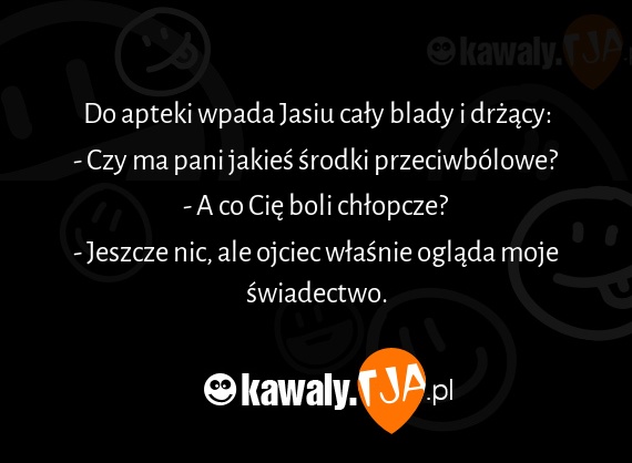 Do apteki wpada Jasiu caly blady i drzacy: - Czy ma pani jakies srodki przeciwbolowe? - A co Cie boli chlopcze? - Jeszcze nic, ale ojciec wlasnie oglada moje swiadectwo.