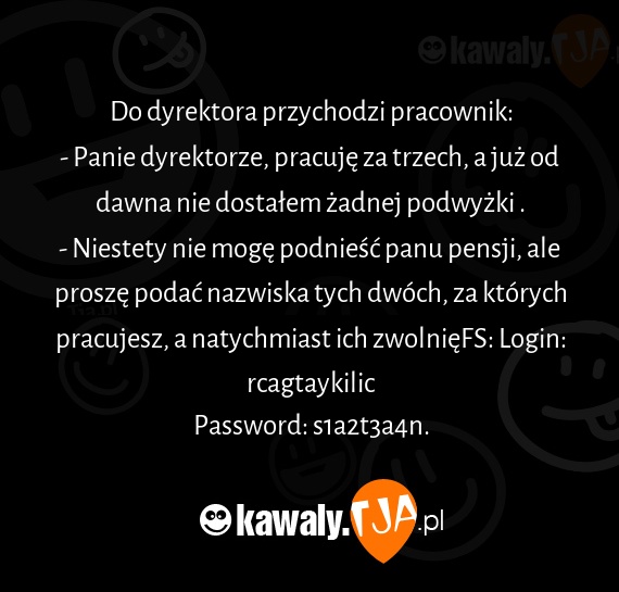 - Niestety nie mogę podnieść panu pensji, ale proszę podać nazwiska tych dwóch, za których pracujesz, a natychmiast ich zwolnięFS: Login: rcagtaykilic