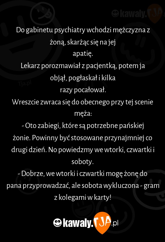 - Dobrze, we wtorki i czwartki mogę żonę do pana przyprowadzać, ale sobota wykluczona - gram z kolegami w karty!