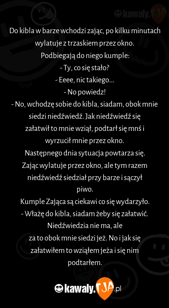 - No, wchodzę sobie do kibla, siadam, obok mnie siedzi niedźwiedź. Jak niedźwiedź się załatwił to mnie wziął, podtarł się mnś i wyrzucił mnie przez okno.