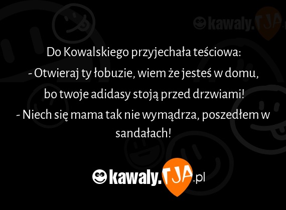 Do Kowalskiego przyjechala tesciowa: - Otwieraj ty lobuzie, wiem ze jestes w domu, bo twoje adidasy stoja przed drzwiami! - Niech sie mama tak nie wymadrza, poszedlem w sandalach!