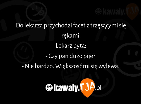 Do lekarza przychodzi facet z trzęsącymi się rękami. Lekarz pyta: - Czy pan dużo pije? - Nie bardzo. Większość mi się wylewa.