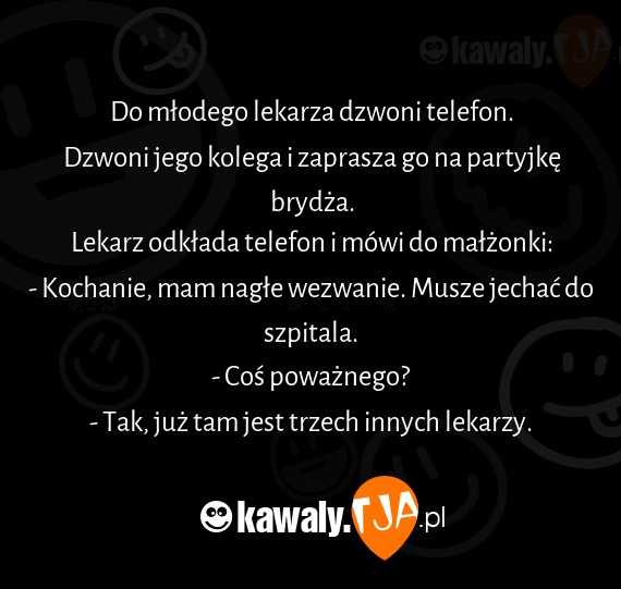 Do młodego lekarza dzwoni telefon. Dzwoni jego kolega i zaprasza go na partyjkę brydża. Lekarz odkłada telefon i mówi do małżonki: - Kochanie, mam nagłe wezwanie. Musze jechać do szpitala. - Coś poważnego? - Tak, już tam jest trzech innych lekarzy.