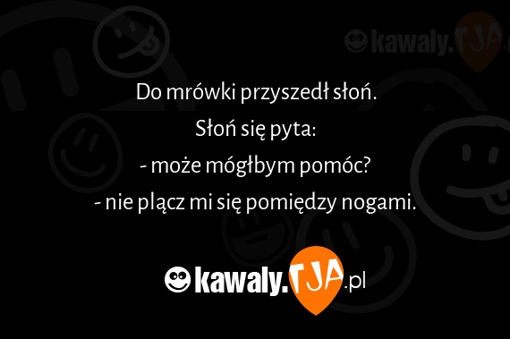 Do mrówki przyszedł słoń. Słoń się pyta: - może mógłbym pomóc? - nie plącz mi się pomiędzy nogami.
