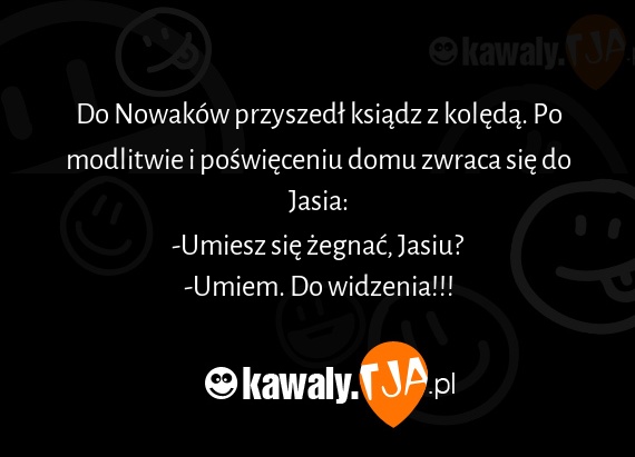 Do Nowaków przyszedł ksiądz z kolędą. Po modlitwie i poświęceniu domu zwraca się do Jasia: -Umiesz się żegnać, Jasiu? -Umiem. Do widzenia!!!