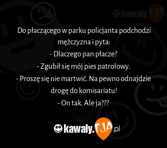 Do placzacego w parku policjanta podchodzi mezczyzna i pyta: - Dlaczego pan placze? - Zgubil sie moj pies patrolowy. - Prosze sie nie martwic. Na pewno odnajdzie droge do komisariatu! - On tak. Ale ja???