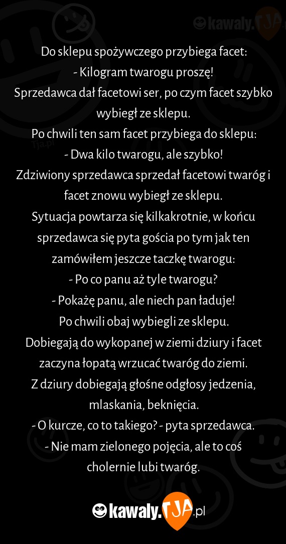 Sytuacja powtarza się kilkakrotnie, w końcu sprzedawca się pyta gościa po tym jak ten zamówiłem jeszcze taczkę twarogu: