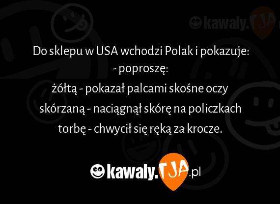 Do sklepu w USA wchodzi Polak i pokazuje: - poproszę: żółtą - pokazał palcami skośne oczy skórzaną - naciągnął skórę na policzkach torbę - chwycił się ręką za krocze.