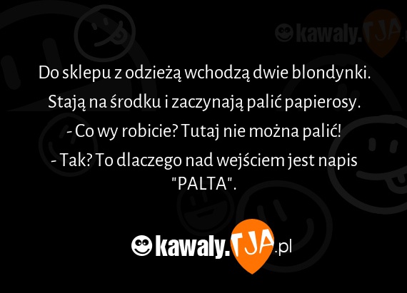 Do sklepu z odzieżą wchodzą dwie blondynki. Stają na środku i zaczynają palić papierosy. - Co wy robicie? Tutaj nie można palić! - Tak? To dlaczego nad wejściem jest napis "PALTA".