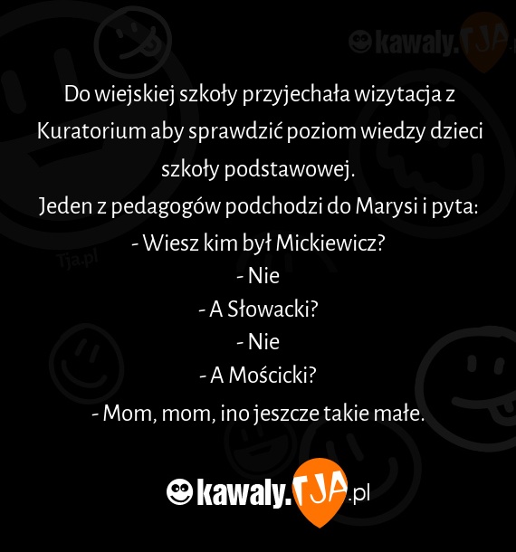 Do wiejskiej szkoły przyjechała wizytacja z Kuratorium aby sprawdzić poziom wiedzy dzieci szkoły podstawowej.