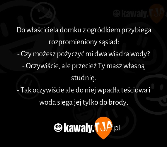 Do właściciela domku z ogródkiem przybiega rozpromieniony sąsiad: - Czy możesz pożyczyć mi dwa wiadra wody? - Oczywiście, ale przecież Ty masz własną studnię. - Tak oczywiście ale do niej wpadła teściowa i woda sięga jej tylko do brody.