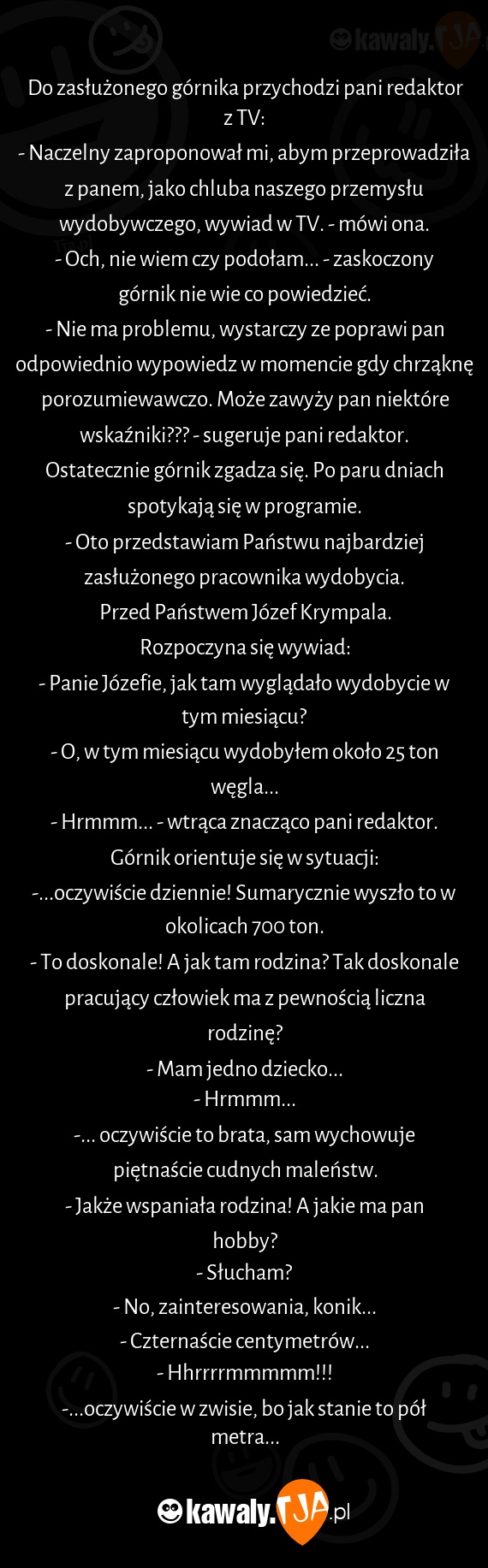 - Naczelny zaproponował mi, abym przeprowadziła z panem, jako chluba naszego przemysłu wydobywczego, wywiad w TV. - mówi ona.