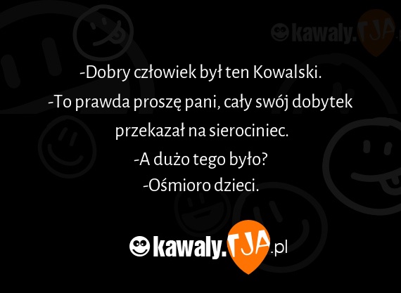 -Dobry człowiek był ten Kowalski. -To prawda proszę pani, cały swój dobytek przekazał na sierociniec. -A dużo tego było? -Ośmioro dzieci.