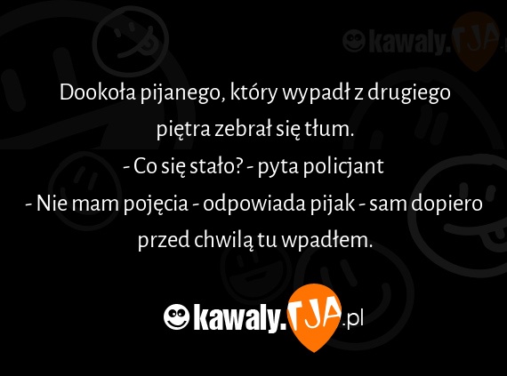 Dookola pijanego, ktory wypadl z drugiego pietra zebral sie tlum. - Co sie stalo? - pyta policjant - Nie mam pojecia - odpowiada pijak - sam dopiero przed chwila tu wpadlem.
