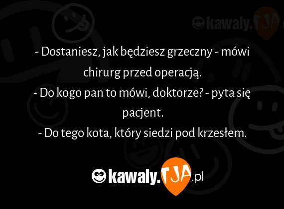 - Dostaniesz, jak będziesz grzeczny - mówi chirurg przed operacją. - Do kogo pan to mówi, doktorze? - pyta się pacjent. - Do tego kota, który siedzi pod krzesłem.