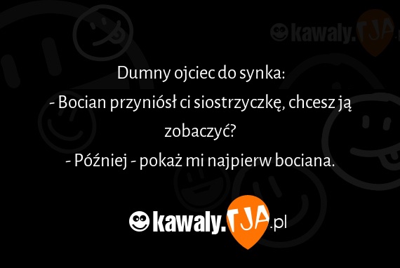 Dumny ojciec do synka: - Bocian przyniósł ci siostrzyczkę, chcesz ją zobaczyć? - Później - pokaż mi najpierw bociana.