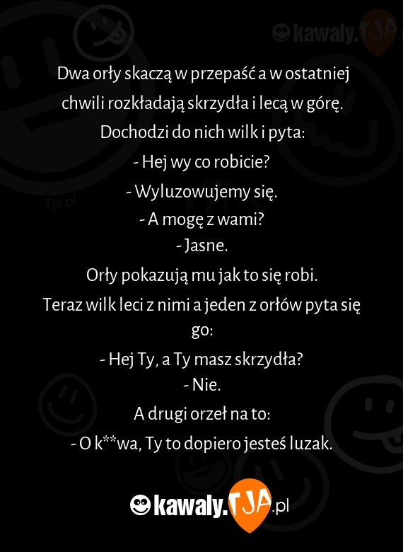 Teraz wilk leci z nimi a jeden z orłów pyta się go: